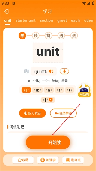 4、进入单词学习页面后,点击【开始读】按钮即可开展单词跟读学习。
