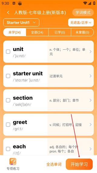 3、在单元词汇列表页面,点击【开始学习】按钮,即可进入单个单词的详细学习界面。