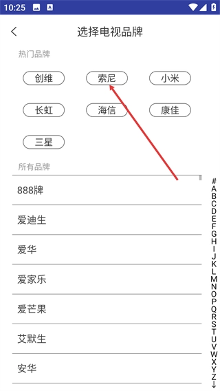 3、在“选择电视品牌”页面,选择目标设备的对应品牌(如“索尼”),系统会生成该品牌设备的遥控界面。