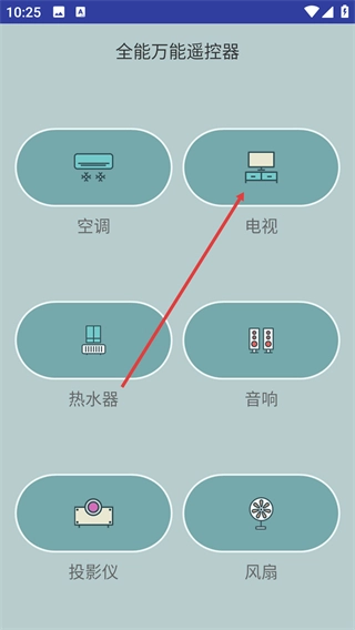 2、在“全能万能遥控器”界面,选择目标设备对应的类型(如“电视”),进入该设备的品牌选择环节。