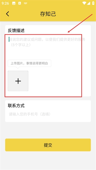 3、进入意见反馈页面后,需要在【反馈描述】框中填写您的建议或遇到的问题,您也可以上传图片来补充相关信息,另外还能填写【联系方式】以便后续沟通。