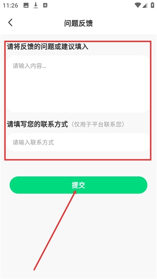 3、在问题反馈页面,填写反馈内容与联系方式后,点击【提交】按钮完成反馈操作。