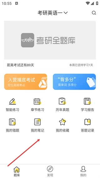 4、进入【题库】主界面,可通过【智能练习】【章节练习】等功能入口,开展考研相关的学习与训练操作。