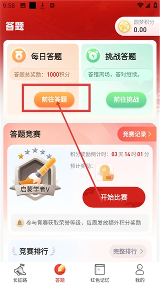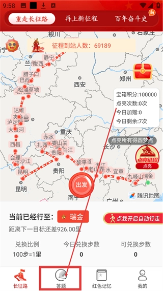 1、在【重走长征路】主界面点击底部的【答题】按钮,即可进入答题页面,参与答题获取积分。