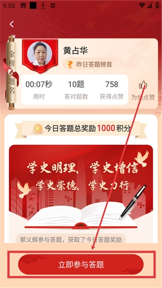 3、在每日答题的准备界面中,点击【立即参与答题】按钮,即可进入今日题库开启答题,向着奖励发起冲击啦。