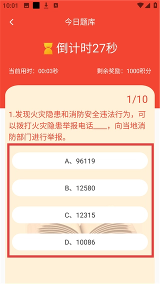 4、进入【今日题库】后会看到限时题目,选择正确选项完成答题,就能积累积分获取奖励哦。