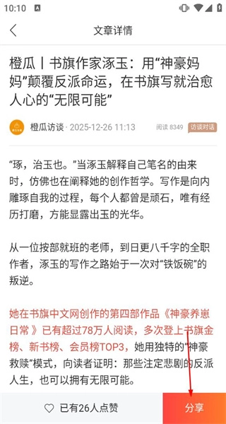 3、进入文章详情页,阅读作家创作经历等内容后,点击页面底部的分享按钮唤起分享选项。