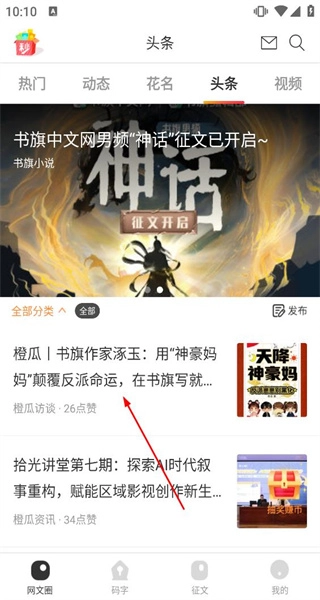 2、进入头条页面,看到书旗征文活动及相关文章,选择橙瓜发布的作家访谈文章进入详情页。