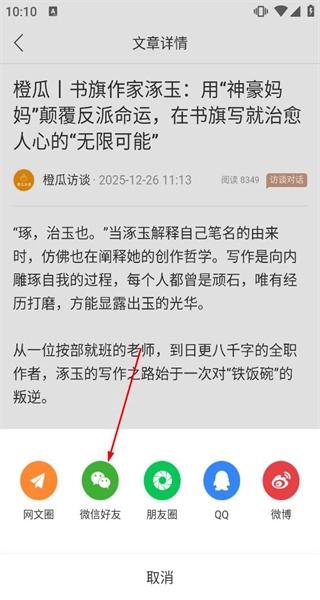 4、在弹出的分享选项里选择微信好友渠道,即可将这篇作家访谈文章分享给对应联系人。
