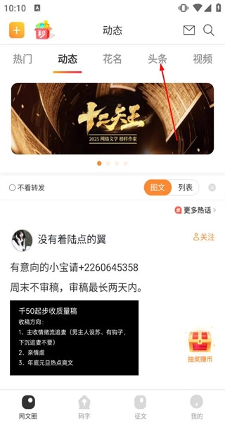 1、打开软件后,进入动态页面,看到热门动态等分类标签,点击头条标签切换至头条内容页面。
