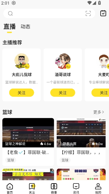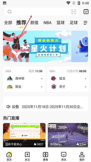 2、在主播板块中,可关注篮球达人主播,获取赛事解说与互动内容。