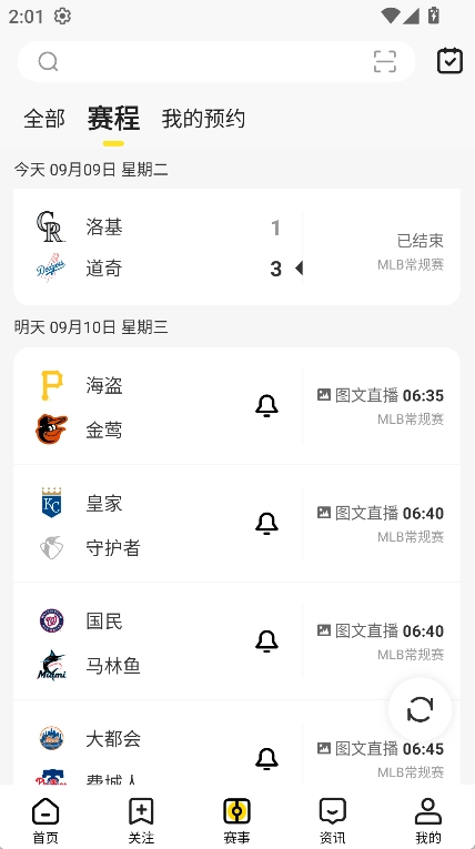 3、打开赛事板块,可查看完整赛程安排,掌握即将进行的比赛时间。