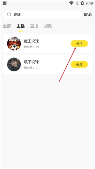 4、找到目标主播,点击其右侧的【关注】按钮,即可完成对该主播的关注。