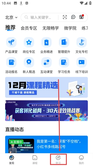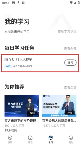 1、在主页面点击底部的【学习】入口,即可进入学习相关界面,在该界面中能够查看学习任务以及推荐内容。