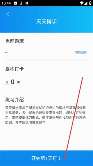 3、进入【天天博学】页面后,能查看练习介绍,点击底部的【开始第1天打卡】按钮,即可准备启动练习。