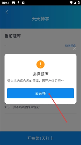 4、点击打卡后会弹出【选择题库】的提示框,此时点击【去选择】按钮,就能挑选合适的题库开始练习了。
