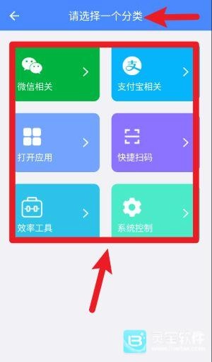 2、点击右下加号键,进入功能分类页后,可清晰选择微信、支付宝、快捷扫码等多个模块,方便查找并快速执行各类操作。