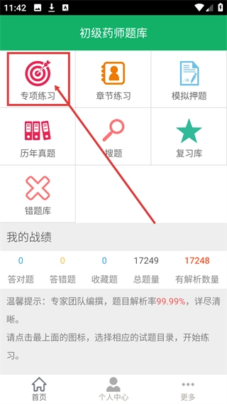 1、在【初级药师题库】页面点击【专项练习】入口,进入专项练习界面,可选择不同知识模块进行练习。