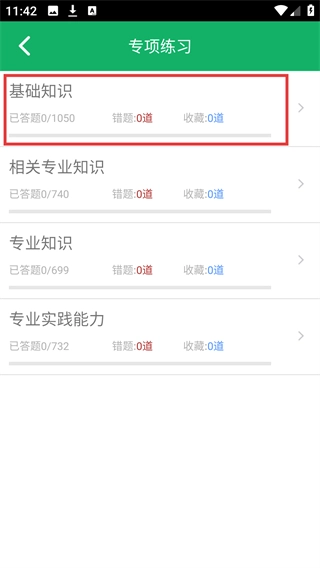2、进入【专项练习】页面后,选择【基础知识】模块,点击即可进入其细分练习页。