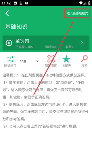 3、在【基础知识】页面,点击右上角【进入新答题模式】按钮,可进入刷题筛选的新答题模式界面。