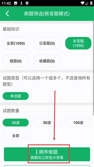 4、在【刷题筛选(新答题模式)】页面,选择试题类型与数量后,点击【顺序做题】即可开始答题并即时看答案。