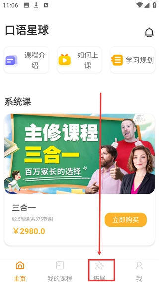 1、在【口语星球】主页点击底部【拓展】入口,进入拓展界面。