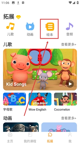 2、进入【拓展】页面后,点击【绘本】分类,即可进入绘本相关内容界面,查看各类绘本资源。