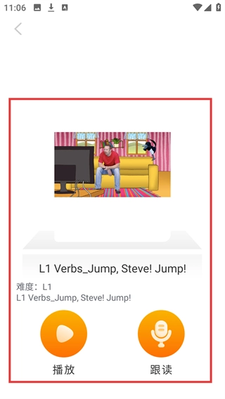 4、在该绘本详情页,可看到其难度为L1,点击【播放】或【跟读】按钮,即可开启绘本的学习模式。