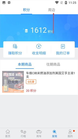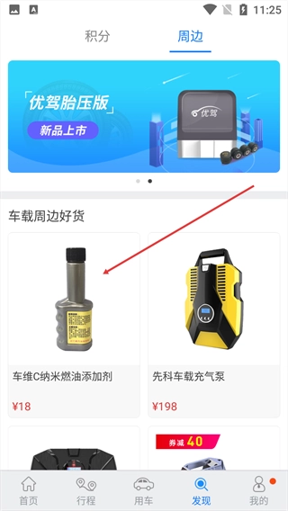2、在发现页面中,点击顶部的【周边】标签,切换至车载周边商品展示区域。