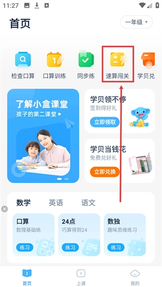 1、在首页找到并点击【速算闯关】的功能入口,即可进入速算闯关的学习界面。