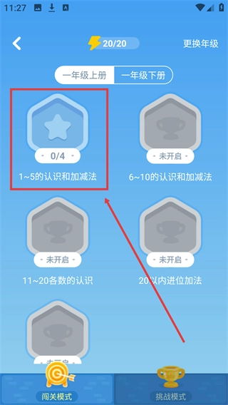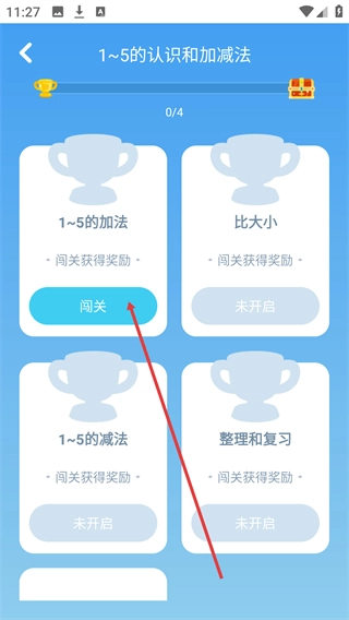 进入速算闯关页面后,找到【1~5的认识和加减法】模块,该模块目前的进度显示为0/4,点击这个模块就能进入它的细分练习页面。