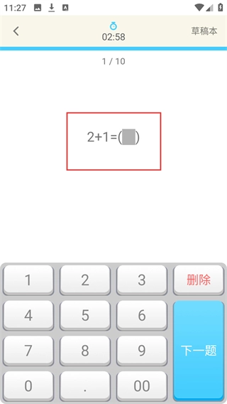 4、进入练习题目页面后,若遇到类似【2+1=】这样的题目,可借助数字键盘输入答案,完成输入后点击【下一题】按钮就能继续练习。