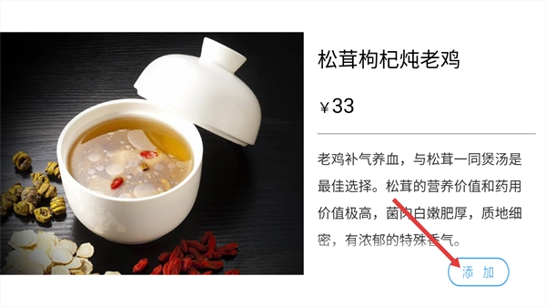 4、进入菜品详情页面后,点击“添加”按钮,即可把该菜品添加至点餐购物车中。