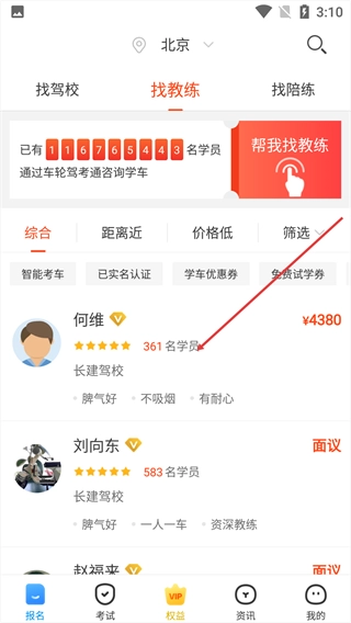 1、打开首页后,点击顶部的“找教练”标签,即可切换到教练列表页面。