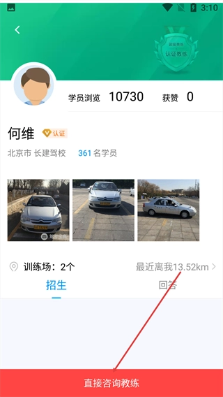 3、进入教练详情页面,点击页面底部的“直接咨询教练”按钮。