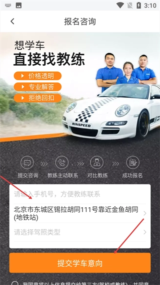 4、把手机号、地址、驾照类型等信息补充完整后,点击“提交学车意向”按钮,即可完成学车咨询的提交操作。