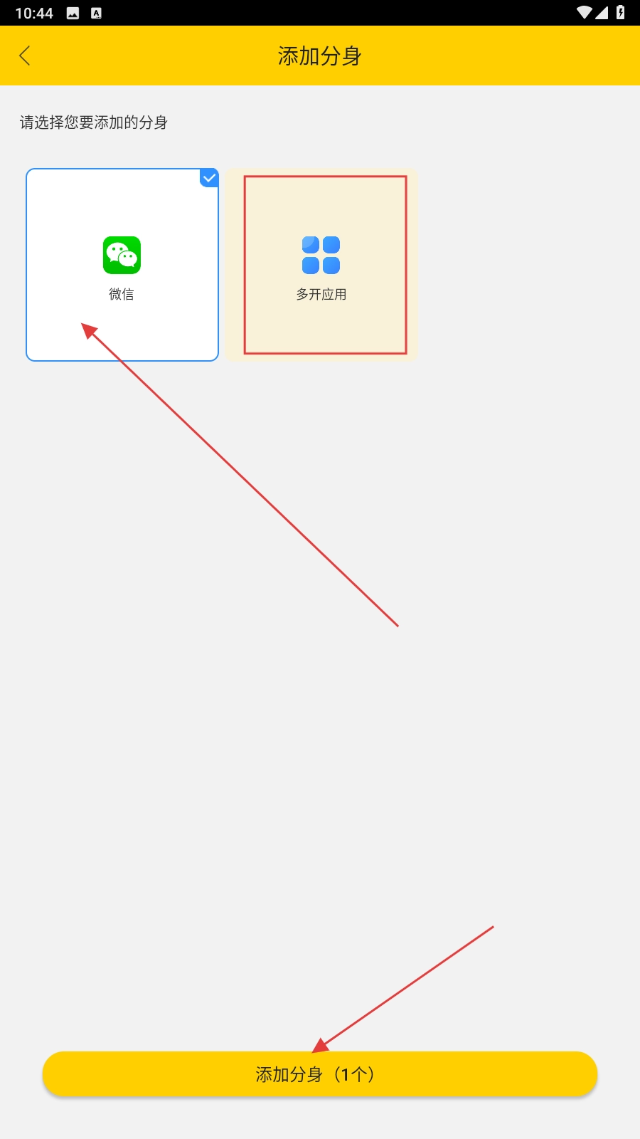 2、进入添加分身页面,选择需要分身的应用(例如【微信】),点击【添加分身】按钮。