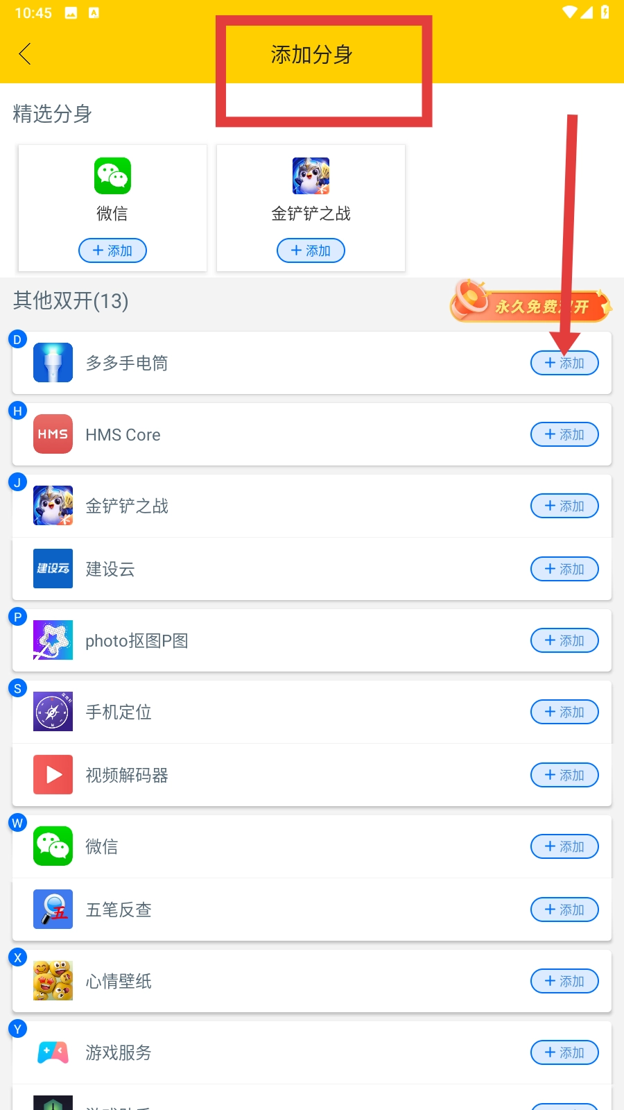 4、进入【添加分身】页面后,找到对应的应用(比如多多手电筒),点击该应用右侧的【+添加】按钮。