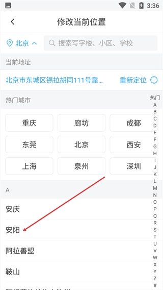 2、进入“修改当前位置”页面后,点击城市选择的下拉按钮,即可展开城市选择列表。
