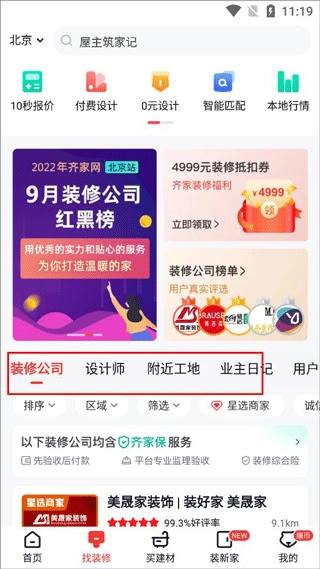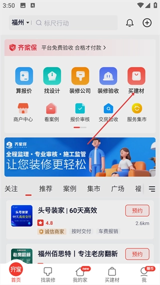 1、打开齐家装修应用,可见首页、找装修、买建材、装新家与我的等功能版块,其中首页呈现了多种可供选择的装修方案;