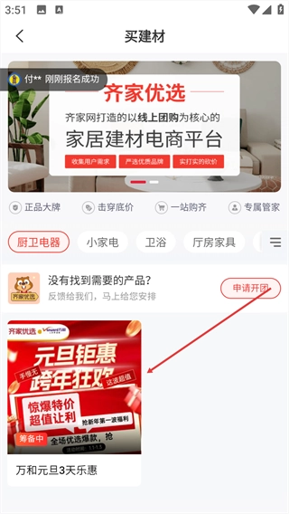 2、进入建材采购页面后,借助分类标签筛选出目标品类,从而定位到该品类对应的商品列表。