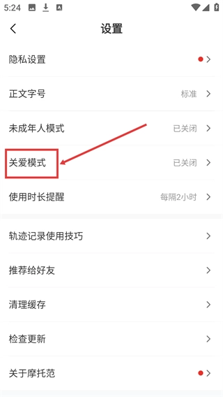 3、在【设置】页面,选择【关爱模式】选项并点击,进入关爱模式的功能说明界面。