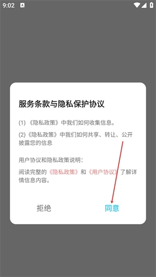 1、在服务条款与隐私保护协议弹窗中,点击【同意】,即可进入应用主界面。
