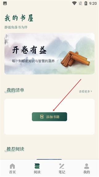 3、在【我的书屋】板块中,找到【我的清单】下的【添加书籍】按钮并点击。