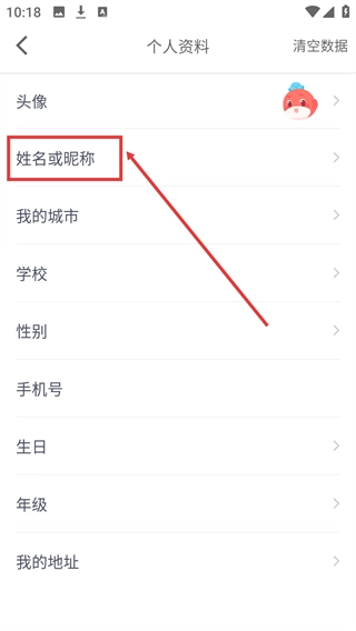 3、在个人资料页面,选择【姓名或昵称】选项,可进入昵称编辑界面。