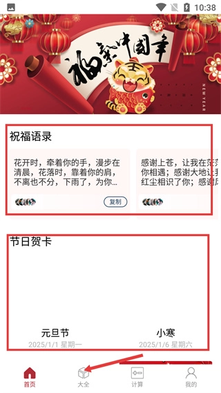 1、在首页,能看到呈现的祝福语录和节日贺卡,点击底部导航栏的“大全”按钮,即可进入祝福大全页面。