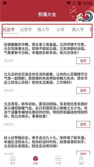 进入祝福大全页面后,顶部的节日标签栏支持切换不同节日,目前默认显示的是“元旦节”对应的祝福语内容。