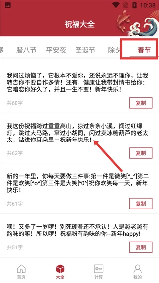 3、在祝福大全的节日标签栏里,点击“春节”标签,即可切换显示春节相关的祝福语列表。