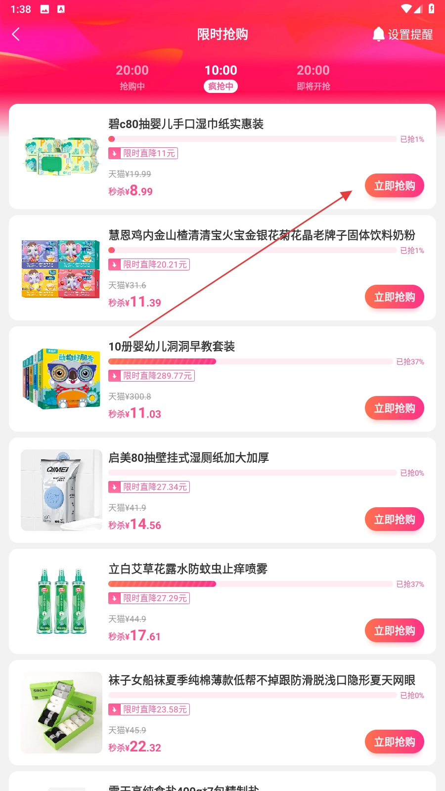 2、在限时抢购页面,点击心仪商品旁的【立即抢购】,可快速下单。