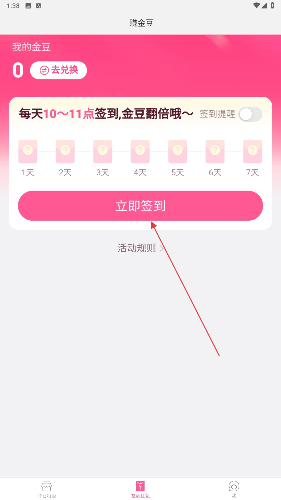 4、点击【立即签到】,可参与签到活动,获取金豆等奖励。